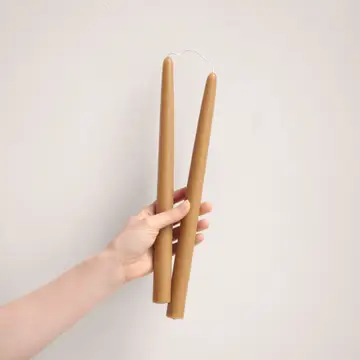 100% beeswax tapers are hand-dipped using naturally filtered beeswax and traditional craftsmanship. Sized to fit a standard taper holder and joined by a cotton wick for the cleanest burn. Beeswax candles can naturally purify your indoor air by releasing negative ions, which help to neutralize pollutants and allergens. Blooming on the surface of beeswax candles is natural and to be expected. Burn time is - one hour per inch. Made in the United States.